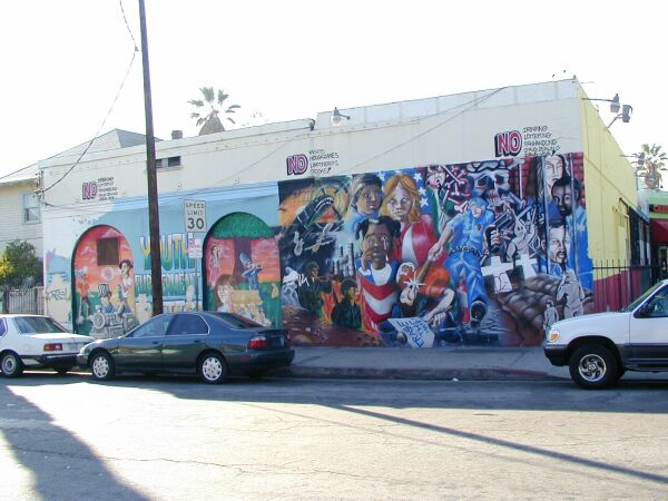 The mural reads "Youth Empowerment Project", but the area of it with the artist, title, and sponsor information has had the paint peeled off. However, one of the artists Emailled me the information. It was done by members of the TNT (The Dynamite Team) and GAW (Ghetto Art Work) crews.