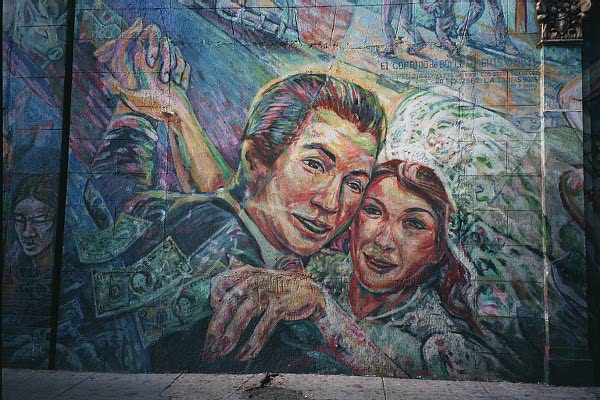 Pictured playing the fiddle is Margarito Gutierrez, Il Piporro on the accordion, and Joe Alaniz enjoying the music. The artists were assisted by Paul Botello, David Morin, and Ismael Cazarez. This is the third mural to occupy this same wall.